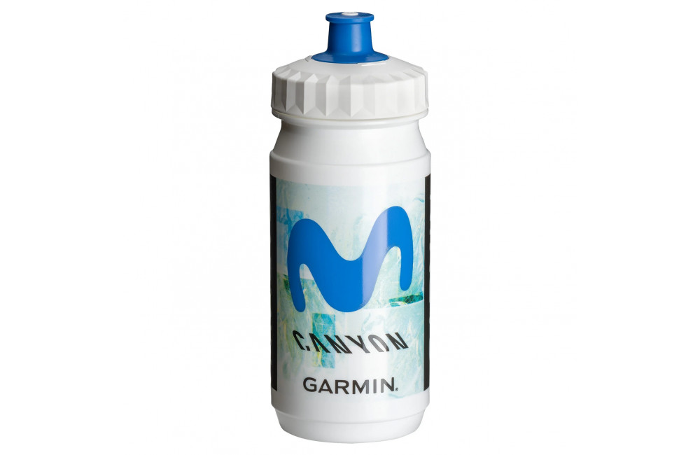 Le bidon Tacx Movistar 2026 se distingue par son couvercle à découpe diamant offrant une meilleure prise et un design unique.